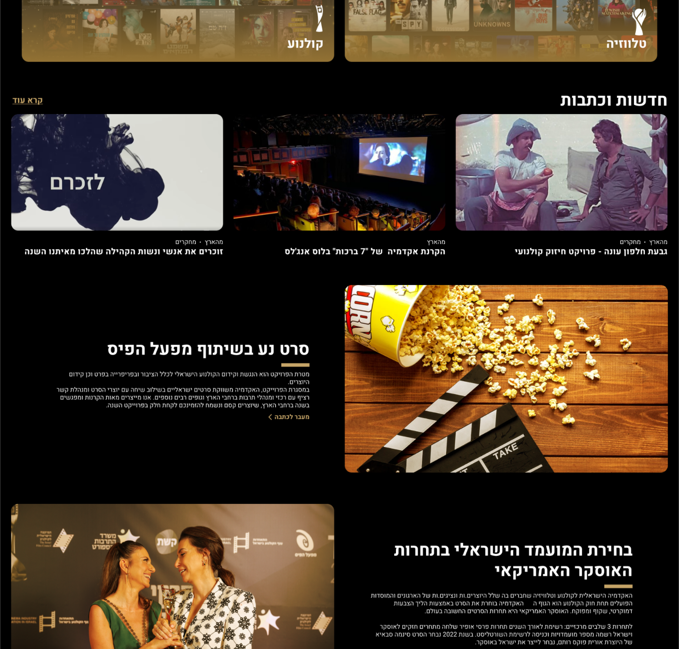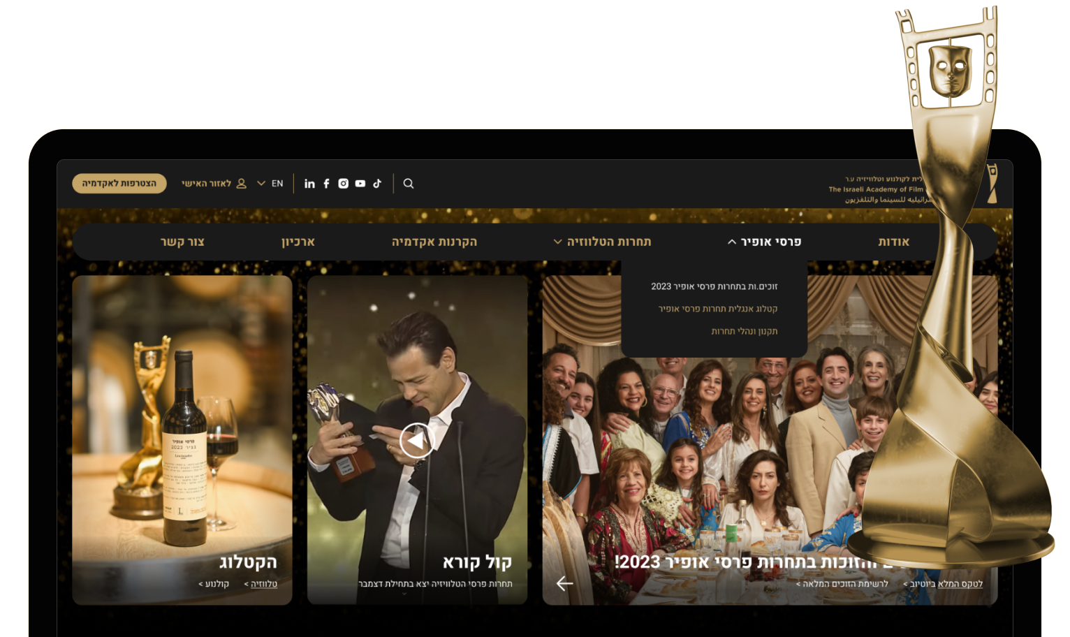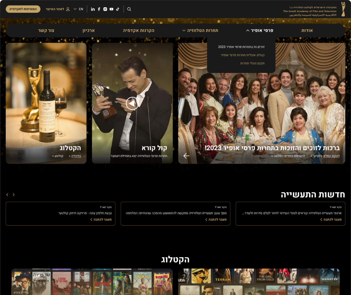The Israeli Academy of Cinema and Television A.R. Established in 1990 with the aim of promoting, encouraging, marketing, and distributing local cinema in Israel and the world, and to celebrate the wide and extraordinary variety of talents and cinematic abilities of Israeli creators in all fields of filmmaking.